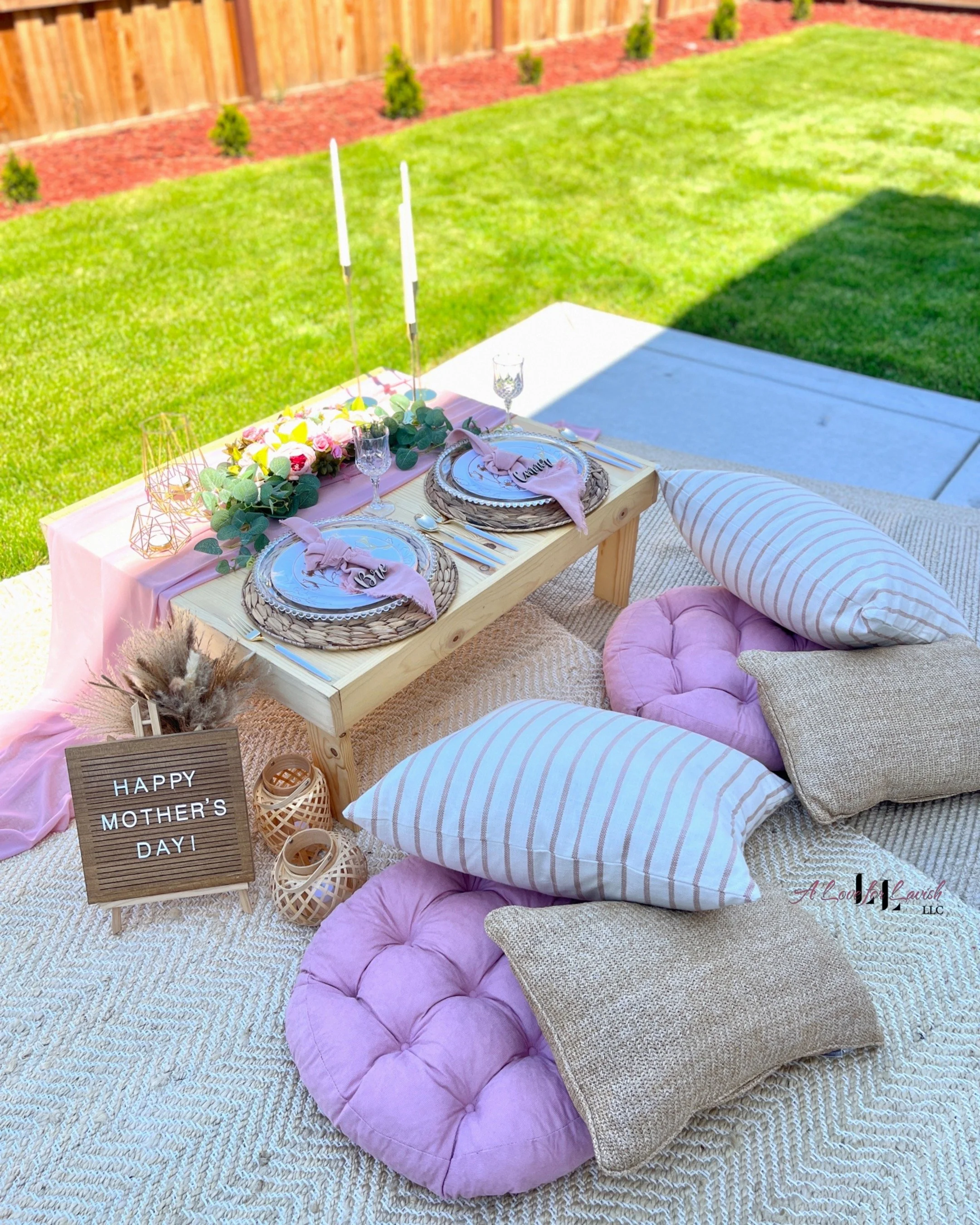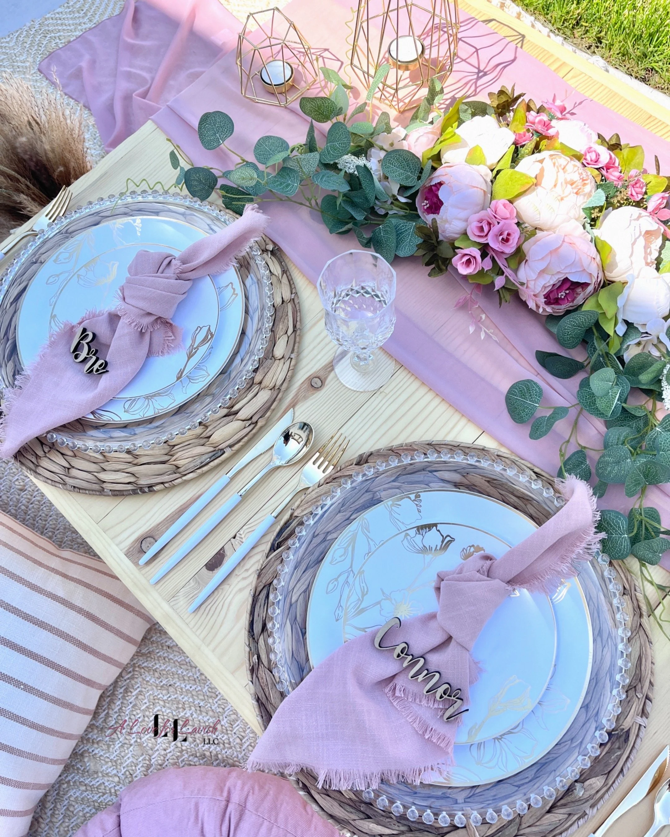 There is nothing more intimate and memorable than a personal, yet stylish picnic. With beautiful accents, this picnic setup is perfect for any occasion. Cater your favorite restaurant and make a date of it! Indoor or outdoor setups available.