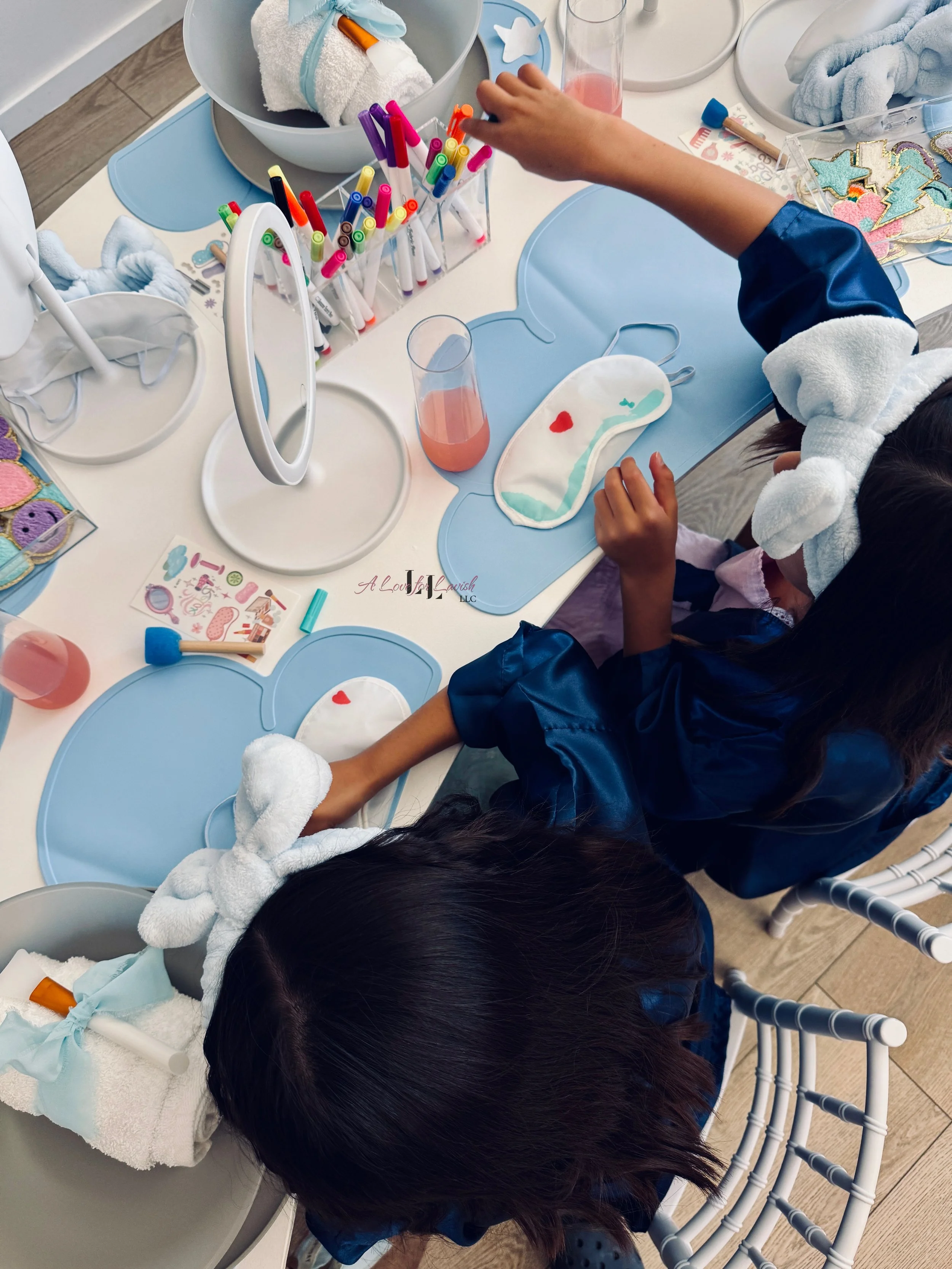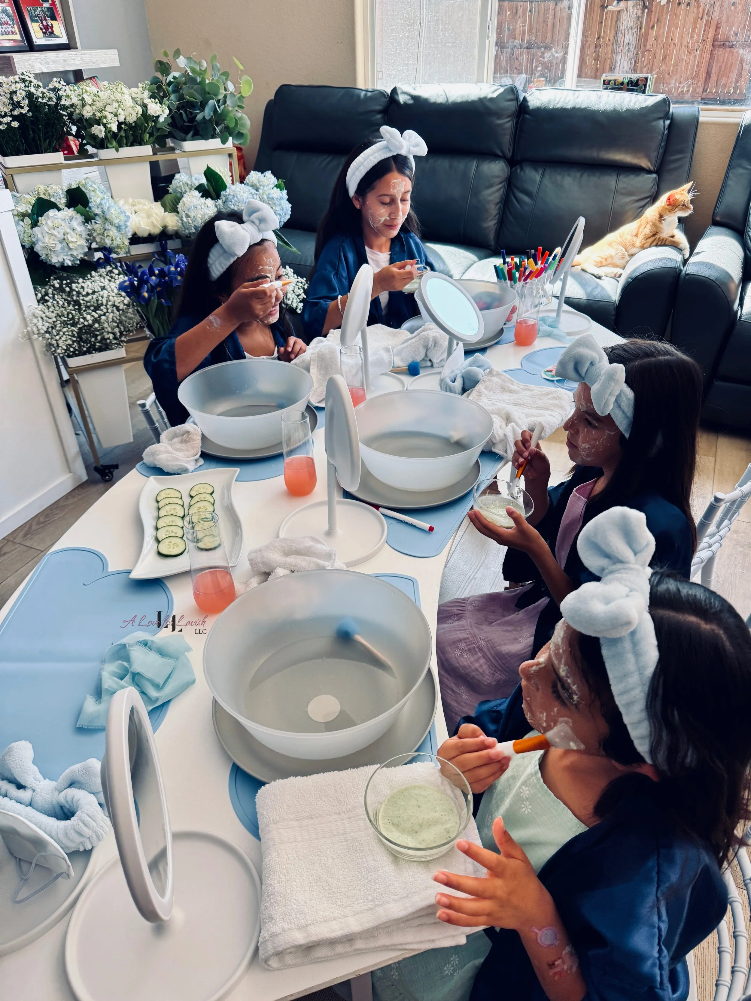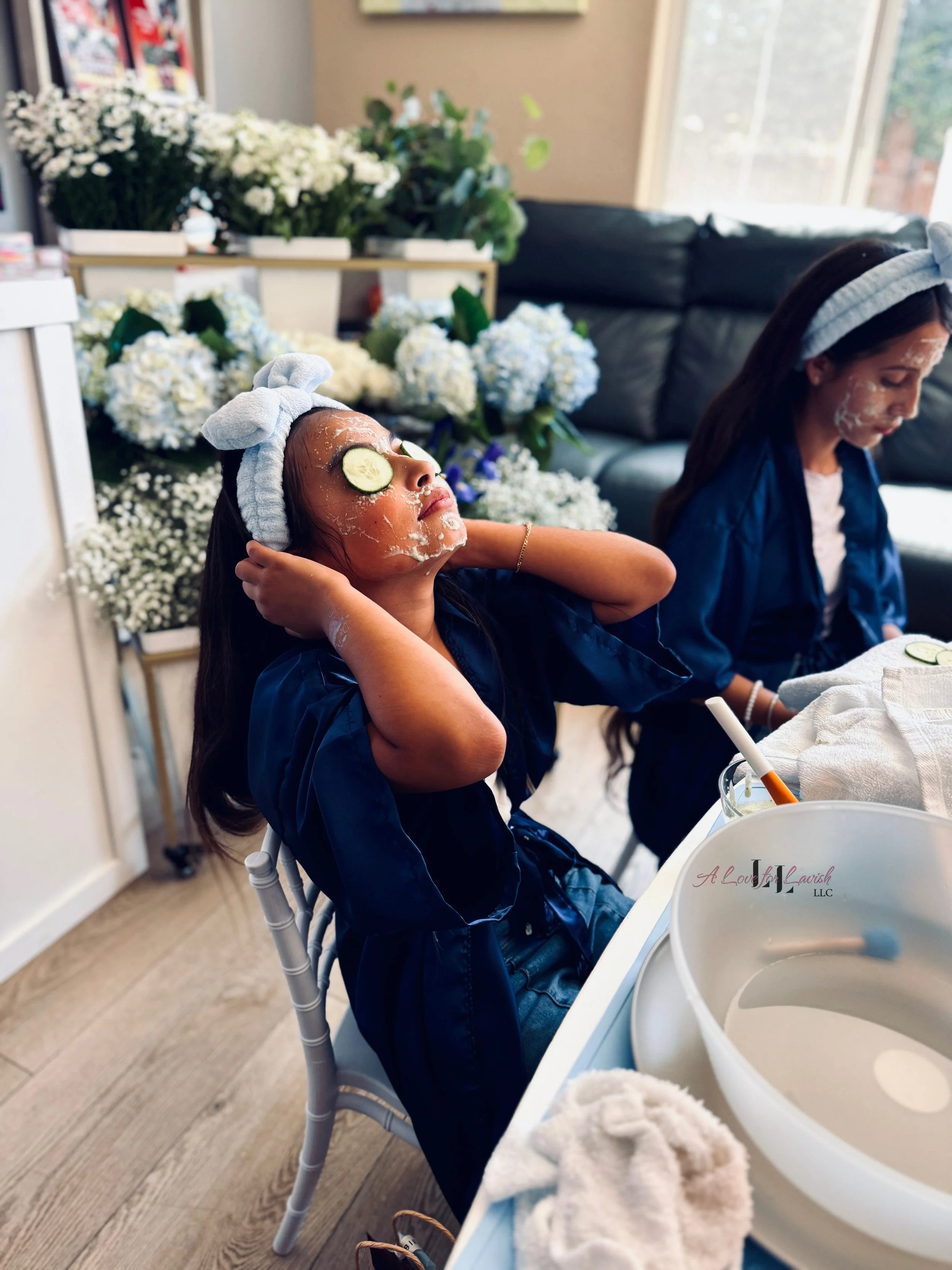Add our mini spas for a unique and relaxing experience for your child and their friends! Complete with everything they need to wind down from a full day of fun. We will cleanse, mask, moisturize and create! Add a backdrop for photo op fun! As we all know, children can have sensitive skin. We believe in using natural ingredients, such as coconut oil and honey, as well as fresh cucumbers, so rest assured! Please note, this is not a class, but a fun activity to introduce your kiddos to self care.